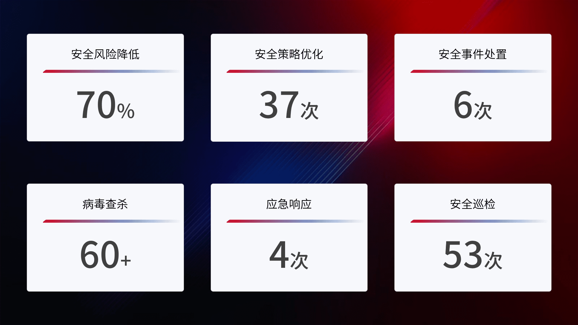 提供全面的安全事件报告体系,,,包括处置报告、、、、周报、、、、季度和年度总结,,,,结合持续监控,,帮助客户深入了解网络安全状况。。